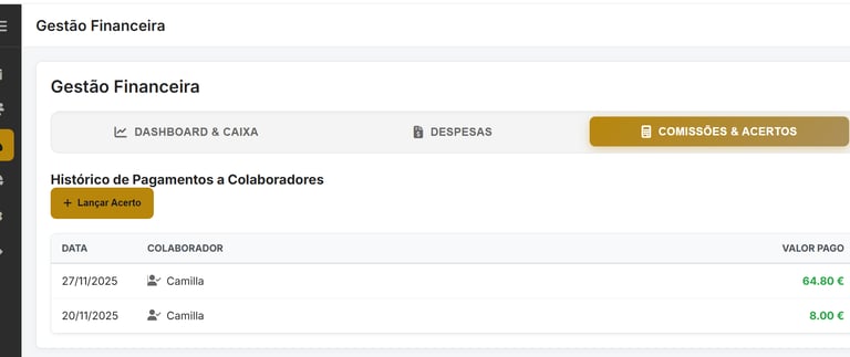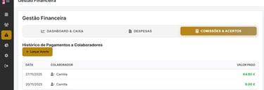 Elimine o trabalho manual no final do mês. O módulo de Acertos rastreia automaticamente receitas e despesas, facilitando o cálculo de comissões e garantindo a transparência do fluxo de caixa